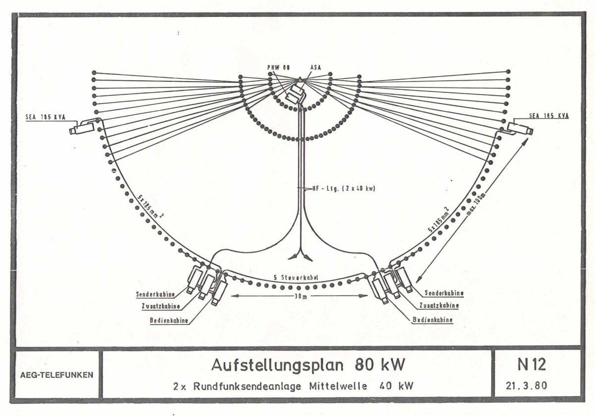 Die folgenden Darstellungen vermitteln einen Eindruck vom Gesamtaufbau und Umfang der Sende-Anlage aus der Vogelperspektive (hier werden beide 40kW Sender verwendet, insgesamt aber nur zwei Stromgeneratoren). Nicht vollständig gezeigt im Vollkreis ist das Erdnetz der Sendeanlage, das radial vom Fußpunkt des 72 Meter hohen Sendemasts in der der Mitte ausgeht (die folgende Darstellung zeigt dies vereinfacht). Sende-, Bedien- und Zusatzkabinen (Shelter) sind ebenso wie die Generatoren außerhalb des Radialnetzes angeordnet, was auch zum Personenschutz des Bedienpersonals beiträgt.