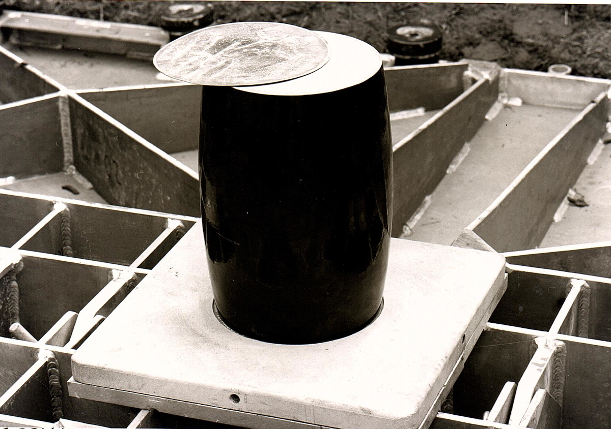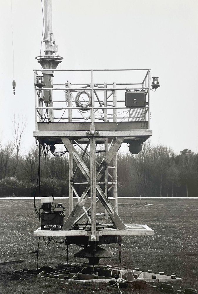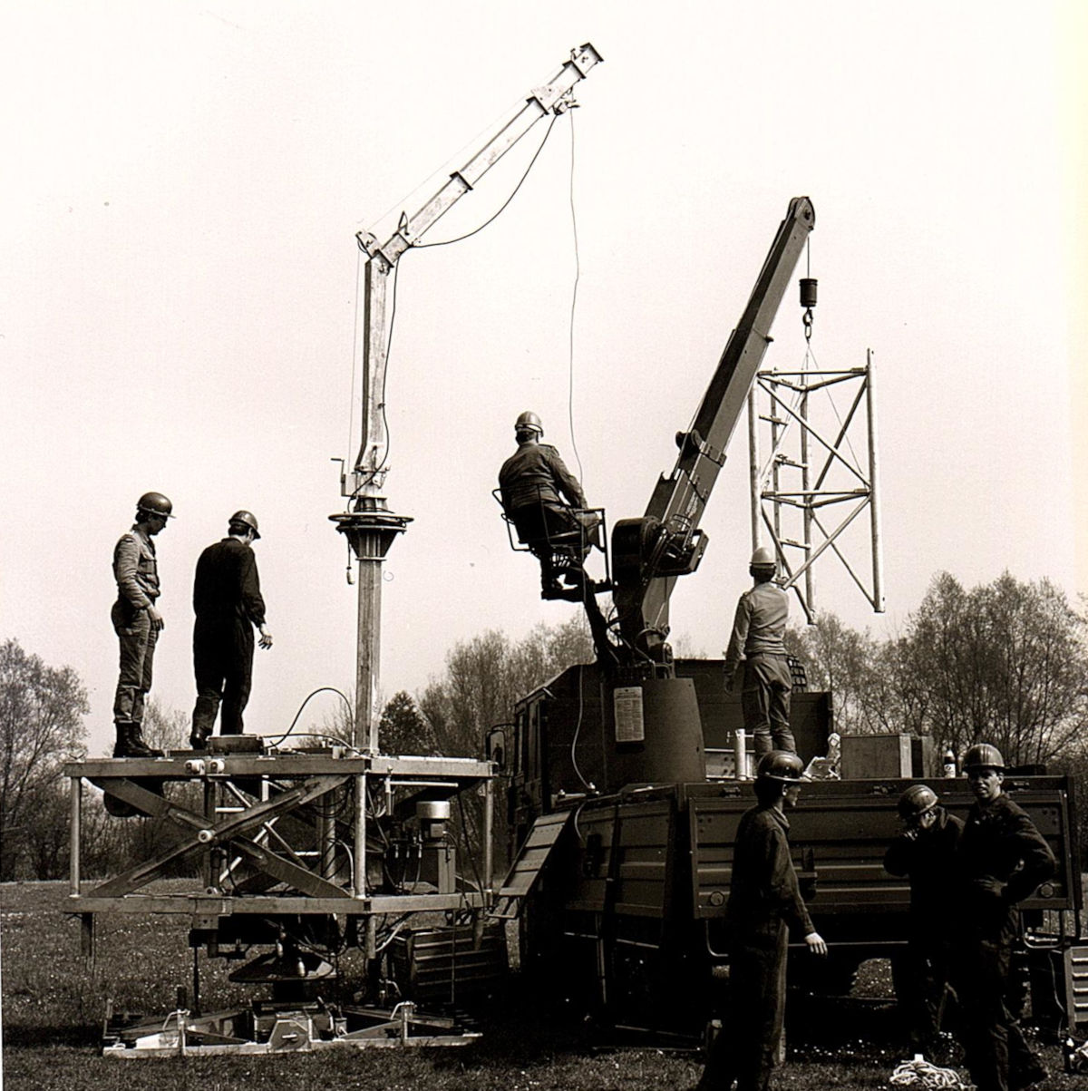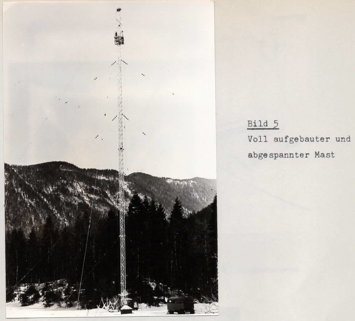 Zum Aufbau des Sendemastes war zunächst ein halbwegs ebenes Gelände notwendig. Hier wurde die Grundplatte, die die oben genannten rund 10t Last und die Zugkräfte der Abspannungen abfangen musste, am Boden fixiert. Darauf aufgesetzt wurde der Isolator, der den Mast elektrisch vom Erdreich trennte. Dann folgte eine Sprühschutz Haube, der erste Mastschuss und die Ausrichtung der hydraulischen Kletterbühne an diesem.