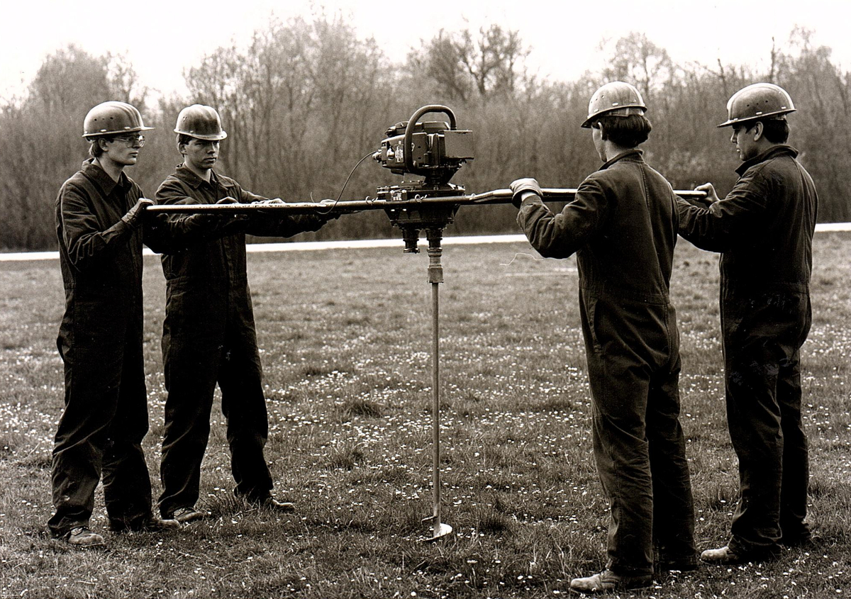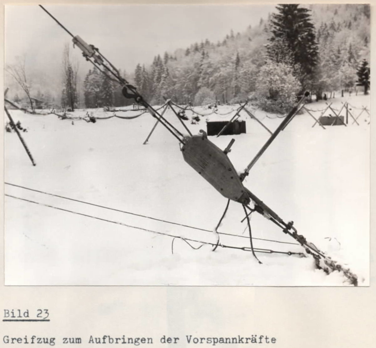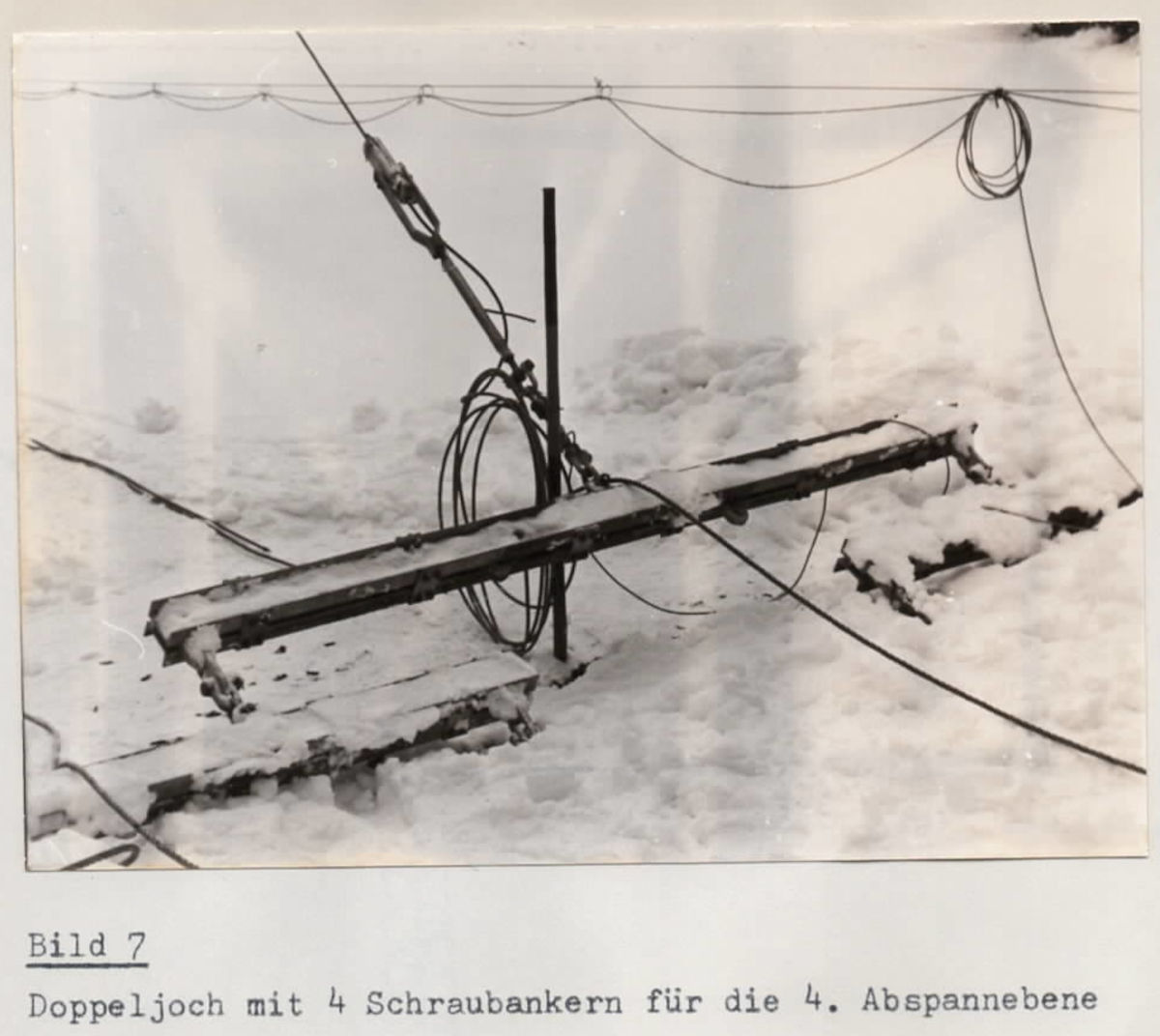 Die folgenden Bilder vermitteln einen Eindruck vom Platzieren der Bodenanker. Zum Einbrigen der vielen notwendigen Bodenanker vor Ort wurde eine Erdbohrmaschine verwendet. Vier Mann waren für das Einbringen erforderlich. Mit den Bodenankern wird das Spannen der einzelnen Abspannungen möglich. Manche der Abspannungen erforderten zustzlich Spannjoche zum Verteilen der Zugkräfte.
