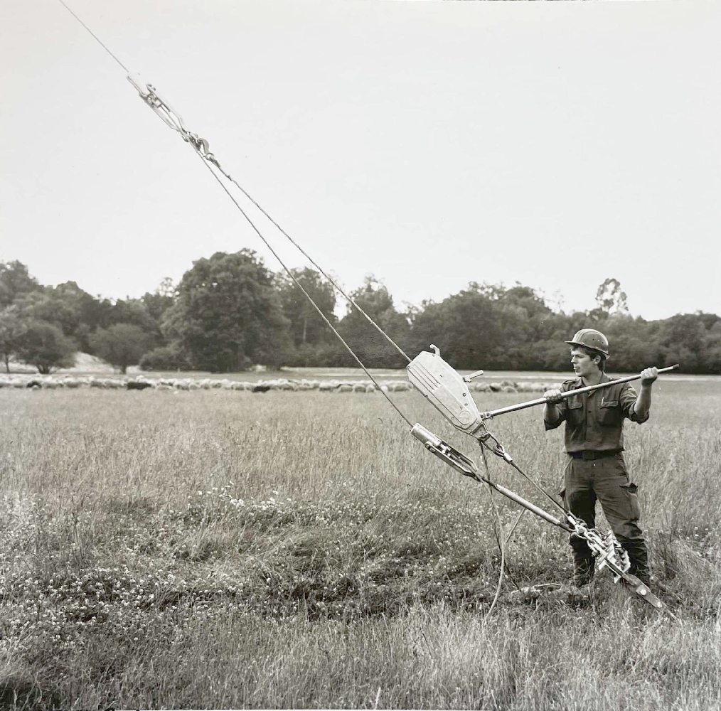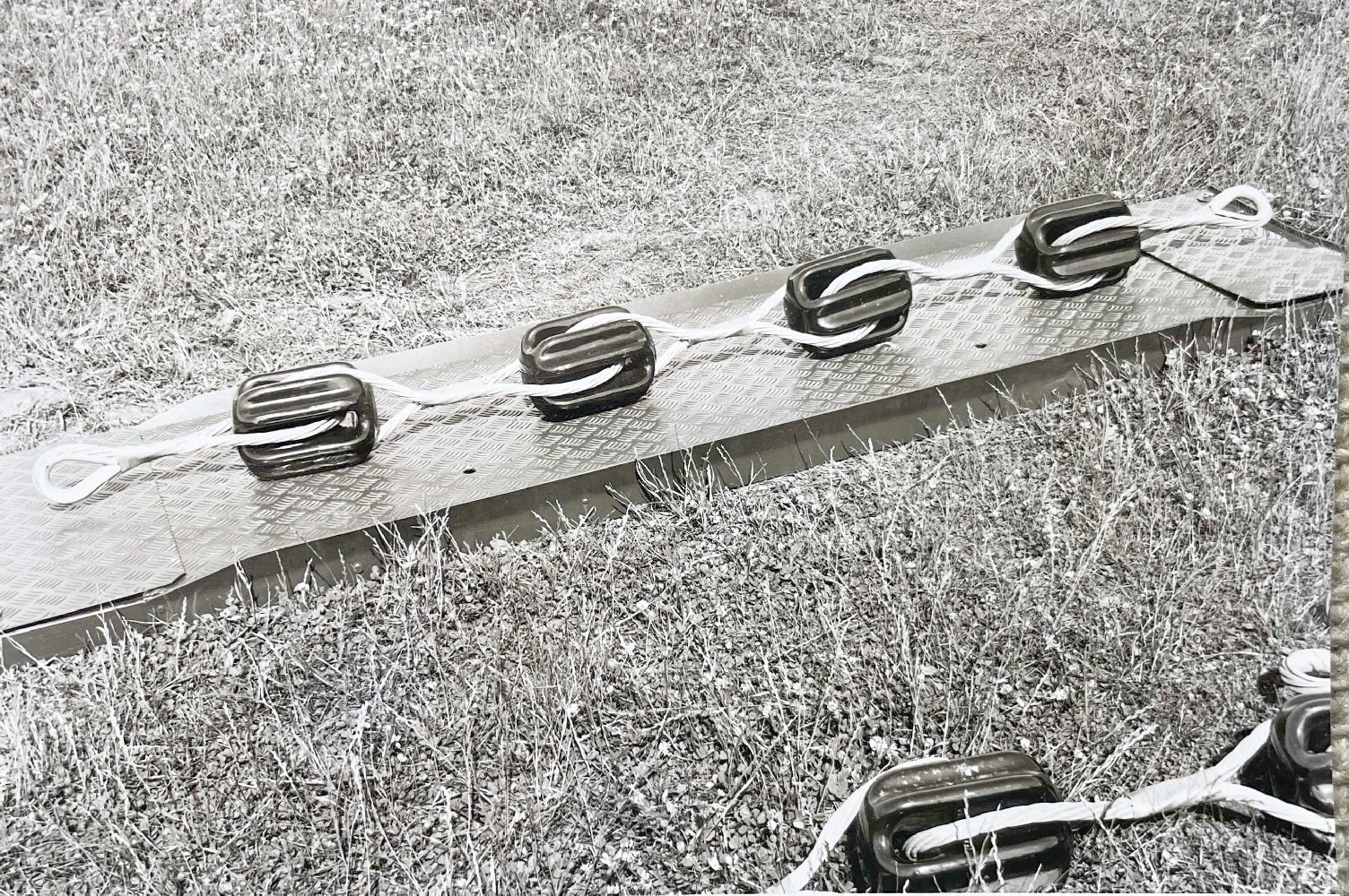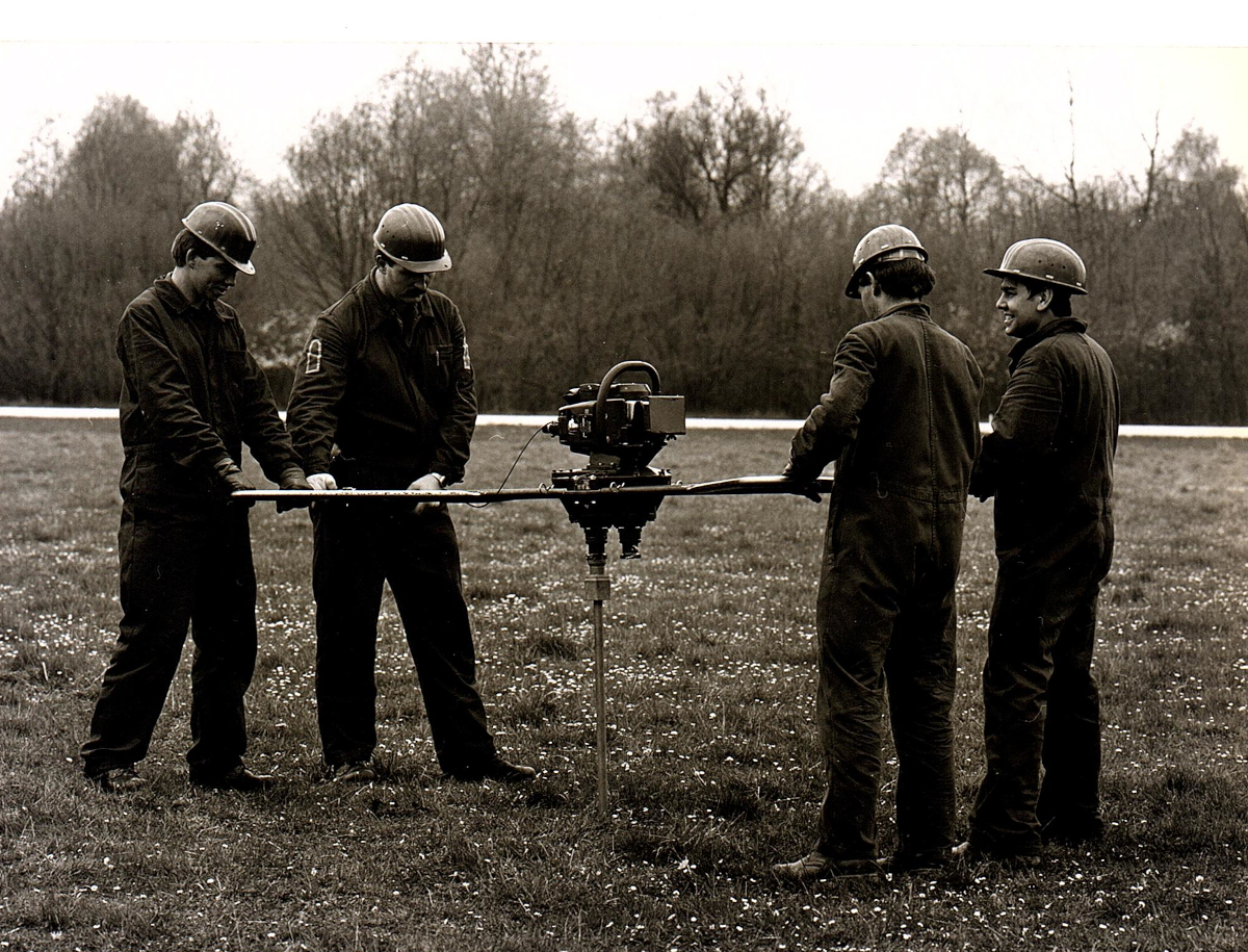 Die folgenden Bilder vermitteln einen Eindruck vom Platzieren der Bodenanker. Zum Einbrigen der vielen notwendigen Bodenanker vor Ort wurde eine Erdbohrmaschine verwendet. Vier Mann waren für das Einbringen erforderlich. Mit den Bodenankern wird das Spannen der einzelnen Abspannungen möglich. Manche der Abspannungen erforderten zustzlich Spannjoche zum Verteilen der Zugkräfte.