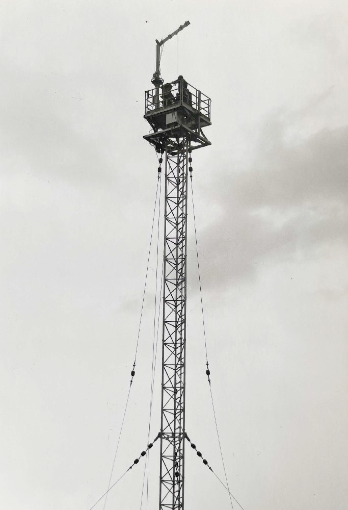 Zur Errichtung des Mastes war eine hydraulische Arbeitsbühne erforderlich, an der ein kleiner Kran mit Windenmotor befestigt war. In Ausführung als Kletterbühne steig diese mit fortschreitendem Aufbau des Mastes jeweils mit einem neu errichteten Mastschuss weiter mit in die Höhe.