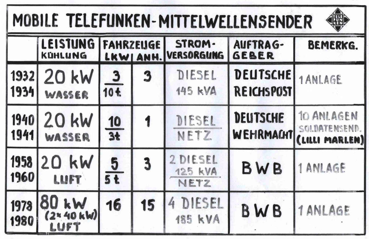 Alle der genannten mobilen Rundfunksender waren während des Zweiten Weltkriegs im Einsatz. Sie wurden von Telefunken, Lorenz, Siemens und AEG hergestellt und geliefert. Die Sender waren nur bis Kriegsende 1945 in Betrieb (siehe obige zwei Ausnahmen). Die folgenden Sender sind bekannt ["Rundfunksender auf Rädern" von Bernd-Andreas Möller].