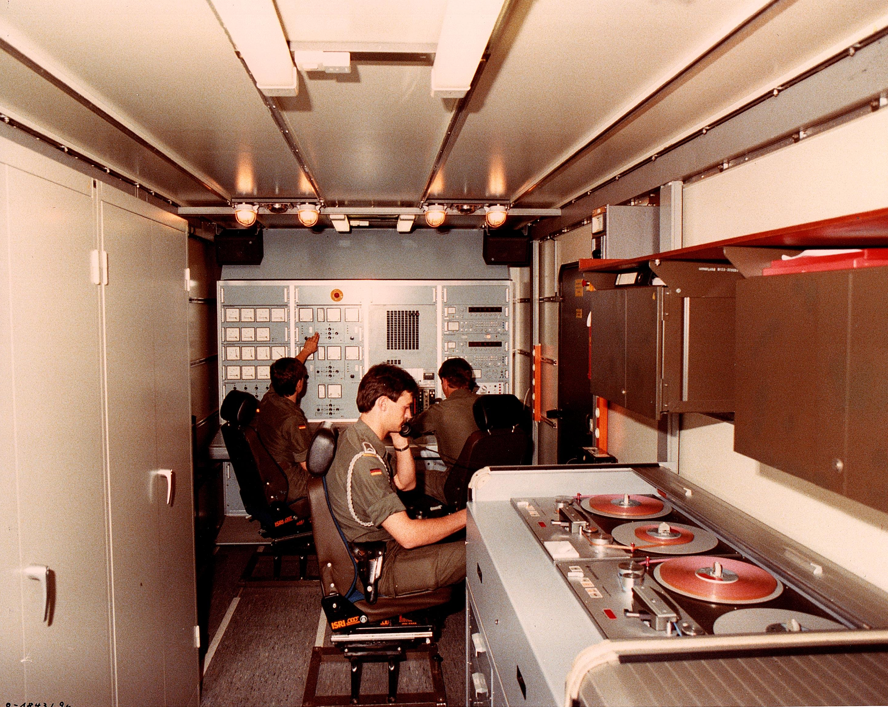 MW Rundfunksender, Typ "R-Sender"1980 gefertigt von TELEFUNKEN - Ulm Verlastbarer Spezial-Mittelwellen-Rundfunksender für die Bundeswehr, bestehend aus zwei Halbanlagen auf LKW, 72m-Antennenmast, Eigenstromversorgung, schallgedämmte Studio-Kabine für Sprecher und Technik-Steuerung, Werkstatt-, Material- und Versorgungsfahrzeuge. Verlegbar mit 20 LKW + 10 Anhänger u. geschulter Mannschaft innerhalb von 3 Tagen. Verwendungszweck: Psychologische Unterstützung der Truppe und der Bevölkerung in Krisenzeiten (Stationsname: Radio Andernach).