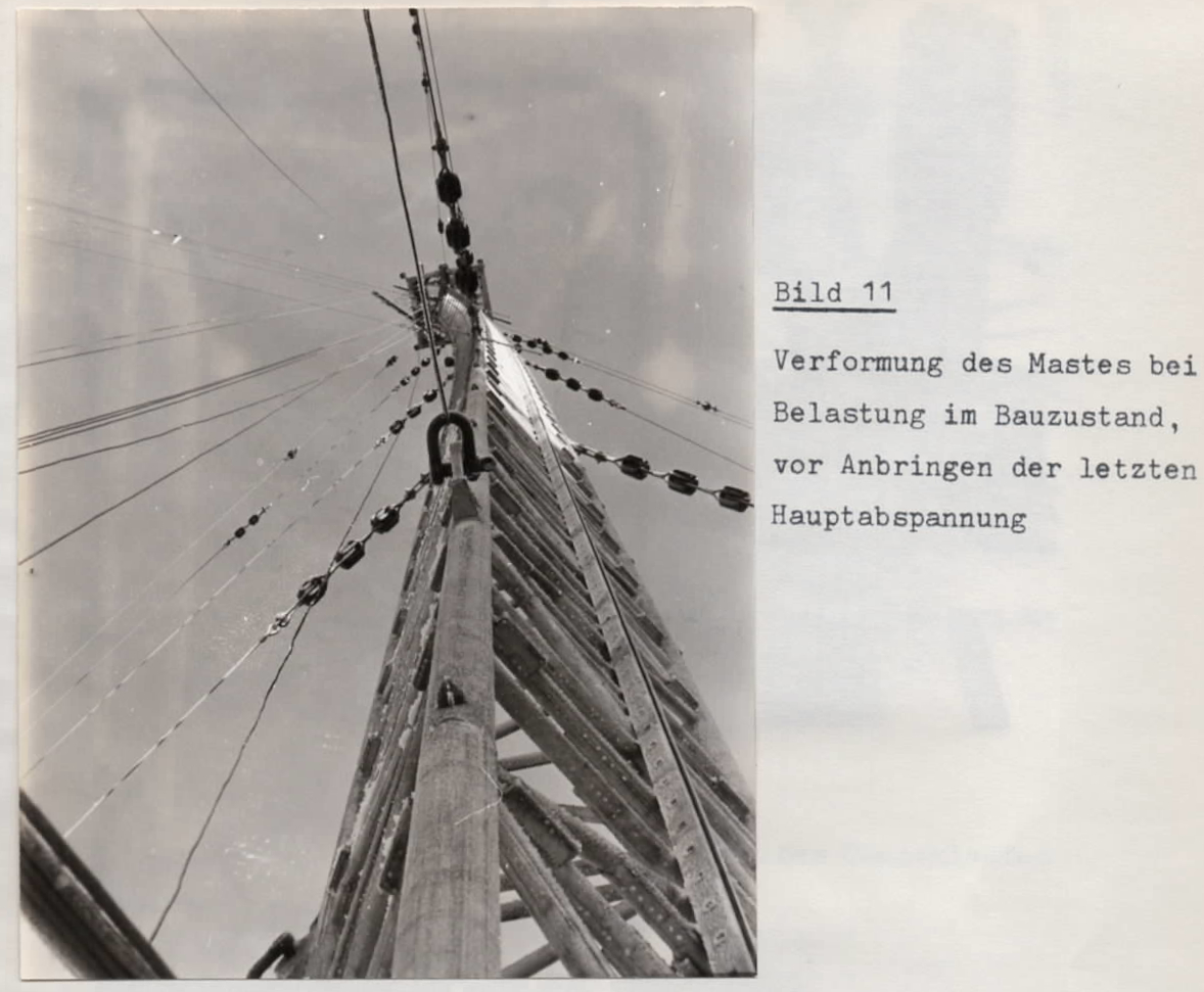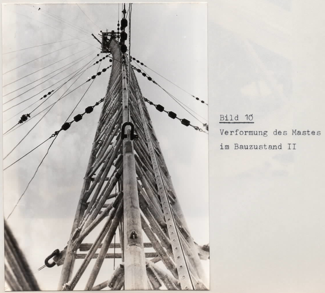 Im Rahmen der Erprobung wurde Windlast in Form von statischen Zusatzkräften auf den aufgebauten Mast simuliert. Die folgenden Ansichten sind nicht verzerrt, sondern zeigen die tatsächlichen Verbiegungen und Verwindungen des Mastes in winterlicher Umgebung.