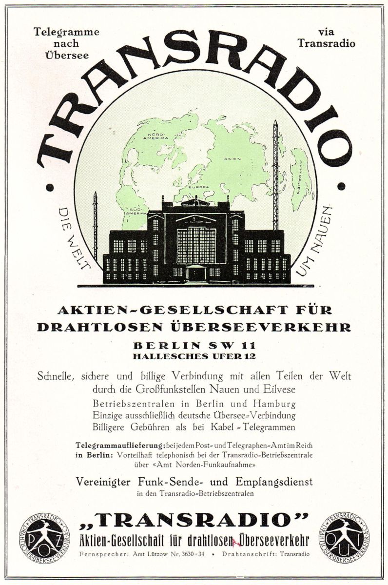 In den frühen Heften befinden sich auch ganzseitige Anzeigen der Transradio AG, einer 1918 von Telefunken, Siemens und AEG gegründeten Aktiengesellschaft für drahtlosen Überseeverkehr. Motto: Transradio, die Welt um Nauen. Transradio hatte u.a. Funkverbindungen nach Nord und Südamerika. Man konnte damals schon bei jedem Postamt ein Telegramm nach Übersee aufgeben, welches dann via Transradio und der Station Nauen übertragen wurde.