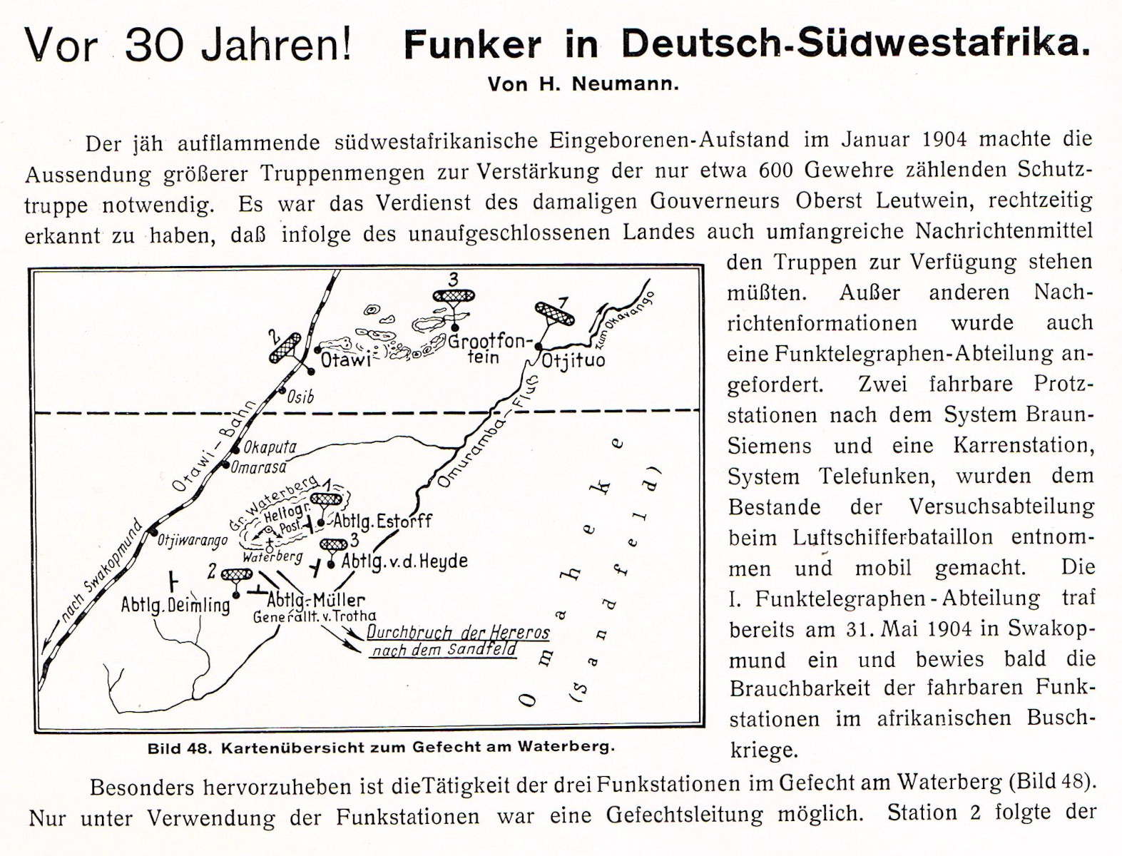 1934, die dunkle Zeit Deutschlands hat gerade erst begonnen, da lesen wir: Vor 30 Jahren! Funker in Deutsch-Südwestafrika. Auf mehreren Seiten wird die Funk-Ausrüstung der deutschen Soldaten im Kampf um den Waterberg beschrieben. Deutsche erzielten mit Hilfe der Funkabteilungen militärische Erfolge. Nicht beschrieben wird der Tod von zirka 80.000 Hereros und Namas, die schutzlos in die wasserarme Wüste Omaheke getrieben wurden. Dieses Vorgehen wird in der Wissenschaft als erster Völkermord des 20. Jahrhunderts bezeichnet. Der Artikel endet mit einer zeittypischen Anmerkung: „Der [1.] Weltkrieg und sein trauriger Ausgang im Frieden von Versailles brachte uns um unsere Kolonien. Auch Deutsch-Südwestafrika, dessen Erde getränkt ist vom Blut vieler deutschen Männer, ging uns verloren …“