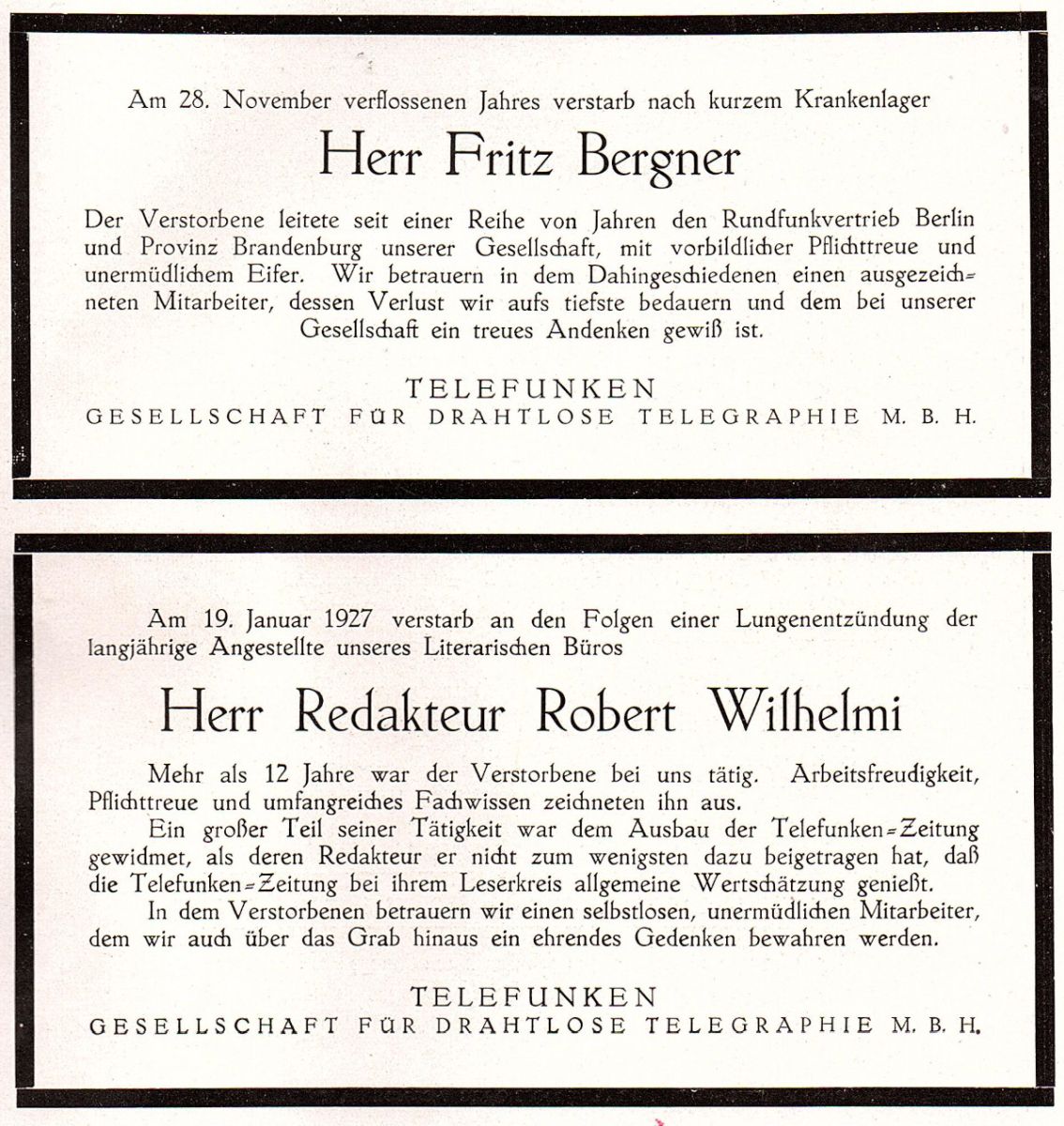 Und wo wir schon bei einem ernsten Thema sind, gleich noch etwas Ernstes: Es wurde der toten Telefunker gedacht, in einer Art, die heute so nicht möglich wäre. Einige Beispiele: „Am 25.11. verstarb nach kurzem Krankenlager Herr Fritz Berger … Am 19.1. verstarb an den Folgen einer Lungenentzündung der langjährige Angestellte unseres literarischen Büros Herr Redakteur Robert Wilhelmi …“ „Am 1.6. verstarb plötzlich in Tokio an den Folgen einer Blinddarmoperation Hans Freiherr v. Gebsattel …“ „Am 31.3. verstarb nach langer Krankheit unsere Angestellte Fräulein Valeska Sokolowski … Plötzlich und unerwartet verschied am 11.6. infolge Blutvergiftung Herr Adolf Thiel …“